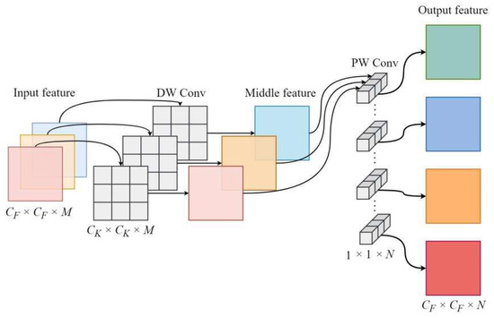 As can be seen from Figure 7, DSC is mainly divided into two parts: DW convolution and PW convolution. The DW convolution differs from the standard convolution in that each convolution kernel is responsible for only one channel, and its complexity reduction ratio is a multiple of the number of channels; the PW convolution is a standard convolution with a kernel size of 1 × 1, and its complexity reduction ratio is the product of the length and width of the convolution kernel. The linear combination of the two parts of convolution can meet the similar feature extraction effect of standard convolution and reduce the model computations and parameters to a certain extent. For example, suppose the input feature size is CF × CF × M, the output feature size is CF × CF × N, the convolution kernel size is CK × CK × N, and the computational amount and number of parameters of the standard convolution are: