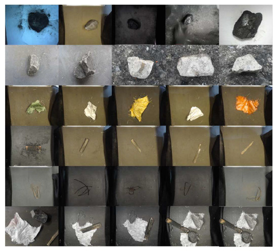 The training samples of the model were divided into two parts. The first part was collected in the field at the mine area, mainly including coal, gangue, and a small amount of other samples, and the second part samples were collected by scrap recycling, mainly including bags, wood, and iron. Our dataset consists of a total of 7825 images (including 1009 coal, 1050 gangue, 1495 wood, 1590 bags, 856 irons, and 1825 multi-target images), and the resolution is 640 × 480. Part of the foreign object image data as shown in Figure 8.
