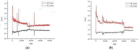 Experiments were executed in Ubuntu 18.04 with the following configurations: the graphics card is an Nvidia Tesla A100 with 40 GB of video memory, the processor is an Intel Xeon 4212R with 128 GB of RAM, and the training environment is Python 3.9 + Pytorch 1.9.0 + Cuda 11.6. Adam optimizer was used to train the model with 80 K iterations and the batchsize is set to 24. The learning rate of the synthesis network and discriminator is set to 0.0005, and the learning rate of the mapping network is set to 0.005. Figure 9 shows the loss curve of our model; the loss curve fluctuates more in the early stage of training because the GAN needs to train two networks at the same time. As the training proceeds, the losses of the generator and discriminator gradually approach each other and level off at a certain number of iteration steps.