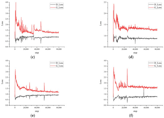 Loss curves of StyleGAN-DSAD. (a) all; (b) coal; (c) gangue; (d) bag; (e) iron; (f) wood.