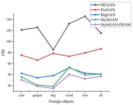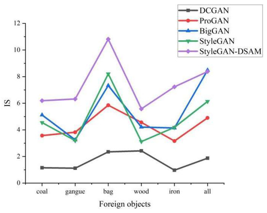 The quality and diversity comparison results of different models are shown in Figure 10 and Figure 11. It can be seen from the figures that the FID and IS of DCGAN and ProGAN are far behind other networks and are not suitable for foreign object image generation. BigGAN is slightly better than StyleGAN in IS metrics, but its FID metrics relative to StyleGAN in coal, gangue, woven bag, and three types of foreign objects on the gap is large, indicating that BigGAN has certain advantages in generating high quality images, but, in contrast, StyleGAN can achieve a better balance between image quality and diversity.