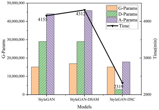 The comparison results of the complexity of the StyleGAN model before and after optimization are shown in Figure 12. G-Params, D-Params, and A-Param indicate the parameters of the generator, discriminator, and whole model (sum of G-Params and D-Params), respectively, and Time indicates training time. As can be seen from the figure, the number of parameters accounted for by the discriminator part of StyleGAN is larger, about 65.8% of the whole network, so it is necessary to reduce the parameters of the discriminator. After the introduction of DSAM in the generator, the parameters of the generator rose a certain amount, accounting for about 11.8% of the original generator, and the total training time of the model increased by 157 min, accounting for 4% of the original training time; after replacing the standard convolution with a depthwise separable convolution, the number of parameters of the discriminator was compressed substantially, and the parameters were reduced to 9.5% of the original discriminator, the total parameters of the model were reduced to 40.5% of the original model, and the total training time is reduced to 57.7% of the original model. In summary, after the introduction of depthwise separable convolution, the number of parameters and training time of the model are effectively reduced, and the time and space complexity of the model is simplified.