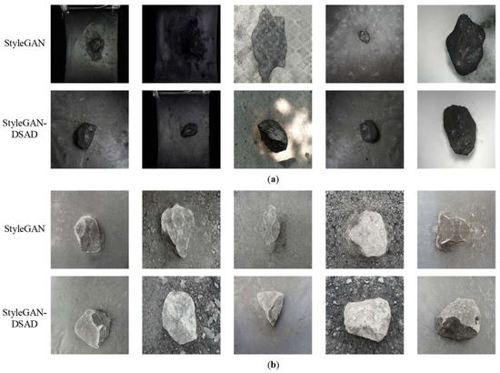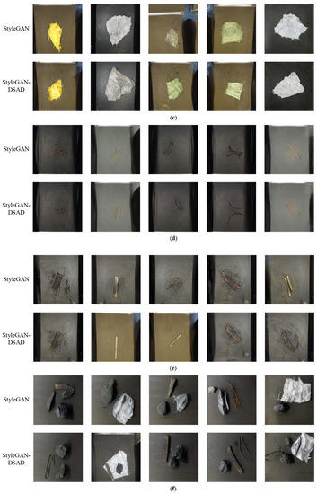 In order to visually demonstrate the effect of the improved model, six types of foreign object images generated by StyleGAN and StyleGAN-DSAD were selected for comparison. As shown in Figure 13, the first row of each type of generated images was generated by StyleGAN, and the second row was generated by StyleGAN-DSAD. Observing the generated images of each group, it is obvious that the StyleGAN generated images have teardrop artifacts, and there are phenomena such as adhesion of the front background and shape distortion. For example, in column 2 of Figure 13a, the coal generated by StyleGAN seriously overlaps with the background, and in column 3, the shape and color of the StyleGAN generated images have produced more obvious distortion, and the generated images are no longer recognizable as coal; similar problems are shown in columns 3, 4, and 5 of Figure 13b, columns 3 and 4 of Figure 13c, columns 3, 4, and 5 of Figure 13d, column 4 of Figure 13e,f. On the contrary, observing StyleGAN-DSAD, the improvement of the generator makes the texture, contour, and color of the generated images clearer and more fitting to the original dataset. At the same time, problems such as front background adhesion and shape distortion are also well improved.