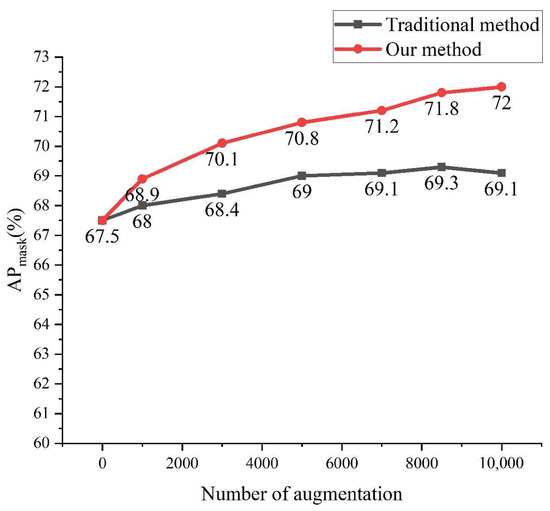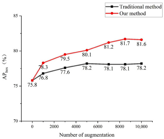 The comparison results are shown in Figure 15 and Figure 16, where the horizontal coordinates indicate the original dataset plus different amounts of augmentation data. It can be seen that the performance of the foreign object detection model is improved by using both augmentation methods, but the generation method is more effective, because the images obtained by the traditional augmentation method are based on the original image, and the diversity is not enough, while the generation method improves the diversity of the dataset to a certain extent, thus better facilitating the model training. When the traditional data augmentation method augments the data to be basically the same as the original dataset, the model accuracy is no longer improved, and the final APbox is improved by 2.4% and APmask is improved by 1.6%. When the data is expanded to 8000 in the generation method, the model accuracy is basically no longer improved, and when it is expanded to 10,000, the model performance reaches the optimum, and then the APbox is improved by 5.8% and APmask is improved by 4.5%.