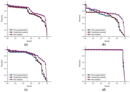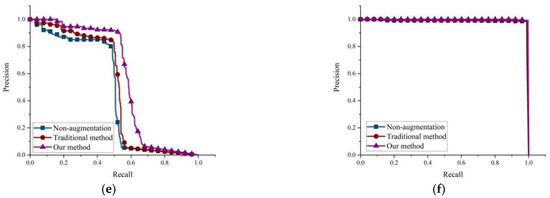 The PR curves of each type of foreign object under different data augmentation methods are shown in Figure 17. From Figure 17d,f, it can be seen that the accuracy of the three datasets is close to each other because the characteristics of bag and wood are more obvious, and the accuracy of our method is slightly higher. From Figure 17a–c,e, it can be seen that the overall accuracy of the model and the detection accuracy of coal, gangue, and iron are significantly improved after using our method compared with non-augmentation and traditional augmentation methods, which indicates that our method has a better promotion effect on the detection of each type of foreign object.