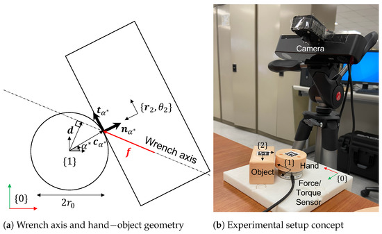(a) Any point on the wrench axis has the same displacement vector from frame 1. Using Equation (4), we determine , the point of pushing. (b) This experimental setup was designed to test the proposed method of estimating the point of contact for circular hands.