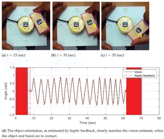 (a–c) Hand−object configurations during the experiments along with annotated Apriltags for computing the visual estimate of hand−object relative orientation. (d) Rolling contact without slipping was ensured by rubber cladding of the hand. Hand−object configurations were varied manually. Object orientation estimated from Apriltags, i.e., vision, plotted against the orientation computed by haptic feedback using Equations (4) and (6).