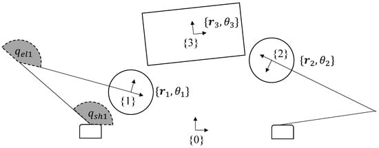 The planar kinematics (see Figure 3) of the object and the dual-arm robot can be described in terms of rigid planar transformations to and from the following frames: