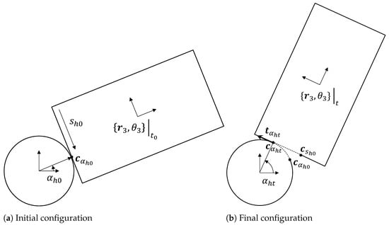 It follows that the displacement of the point of contact on the robot hand is parameterized by and is given by , for this case of circular hands. We can also infer that the displacement of point of contact on the object is equal and opposite—i.e., a positive value of will imply a negative value of . In other words, since the object has straight sides, we have (see Figure 5b). In summary, with the hand and object always in rolling contact without slipping or break of contact, at any instantaneous point in time, the relative movement of the object w.r.t. the hand is composed of (i) a pure rotation about the robot hand and (ii) a pure translation about the tangent at the contact point.