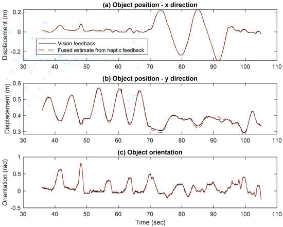 We selected an initial configuration where the slave robot established a firm grasp on the object at = 36 s, which also set . Algorithm 1 was evaluated for all time instances in the experiment given this initial condition. To evaluate our estimates, we propagated the wrench uncertainty through Algorithm 1. First, the force/torque sensors were kept static under no load conditions, and readings were taken to compute , as detailed in Appendix A.2. Using Equations (11)−(14), we then estimated the position and orientation, i.e., and estimated at each time instant. The haptic estimated object position and orientation closely follow the motion tracking results, as shown in Figure 7. This validates the proposed method.