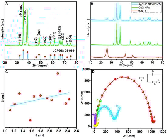 XRD: (A) CuO; (B) AgCuO NPs/fCNTs, CuO, and fCNTs. (C) Williamson–Hall plot of CuO. (D) Nyquist plot of bare SPCE (a), CuO/SPCE (b), fCNTs/SPCE (c), AgCuO NPs/SPCE (d), and AgCuO NPs/fCNTs/SPCE (e).
