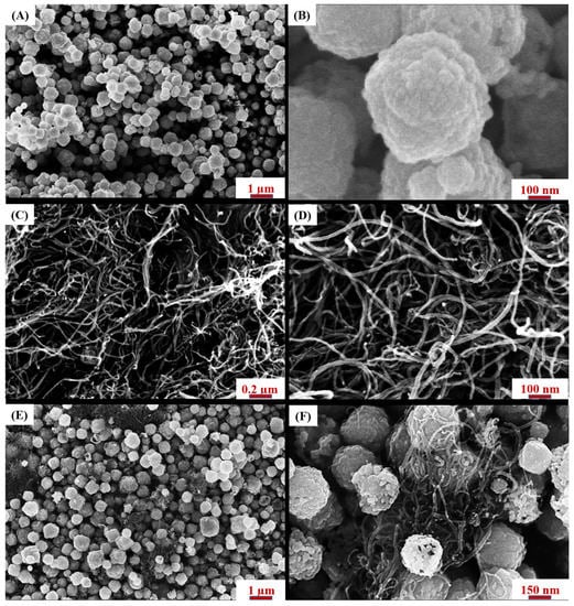 SEM: (A,B) CuO nanoparticles; (C,D) fCNTs; (E,F) AgCuO NPs/fCNTs.