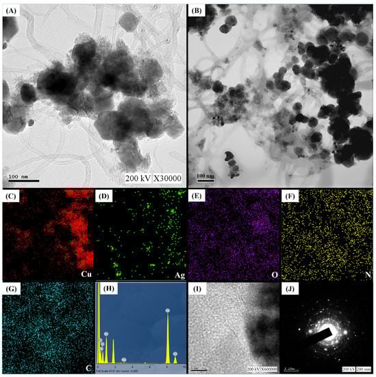 (A) HR-TEM, (B) HAADF-STEM, (C–G) corresponding elemental mapping of copper, silver, oxygen, nitrogen, and carbon, (H) EDX, (I) lattice fringes, and (J) SAED patterns of AgCuO NPs/fCNTs.