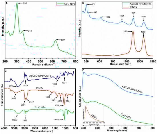 Raman spectrum: (A) CuO; (B) fCNTs and AgCuO NPs/fCNTs. (C) FTIR spectrum: CuO, fCNTs, and AgCuO NPs/fCNTs. (D) Absorbance spectrum of CuO and AgCuO NPs/fCNTs. Inset shows spectra of fCNTs.