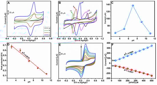 This experiment was performed using cyclic voltammetry by placing AgCuO NPs/fCNTs/SPCE in 0.05 M PBS containing 200 μM APAP. Figure 5B shows the voltametric response obtained by carrying out this experiment in various pH of electrolyte. These curves show the redox peak potential decreases with increase in pH, and lowest potential 0.13 V was achieved at pH 11 and highest 0.67 V at pH 3. Redox peak currents of voltametric curve increases from pH 3 to pH 7 and decreases beyond pH 7. Hence, it is understood the strongest redox peak currents can be obtained when the analyte pH is maintained at 7. From the CV curves obtained from this experiment, calibration plots of pH against peak current and potential were shown in Figure 5C,D, respectively, and the regression equation is Epa (V) = −0.0712pH + 0.9082 (R2 = 0.9818) with slope −71.2 mV/pH. This slope value deviates from the theoretical slope −59 mV/pH as per Nernst equation specifying acetaminophen oxidation process at AgCuO NPs/fCNTs/SPCE is complex.
