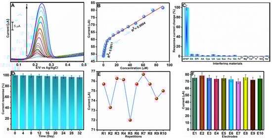 In this work, 10-fold excess concentrations of dopamine (DA), epinephrine (EPI), ascorbic acid (AA), L-cysteine (Cys), uric acid (UA), lactose (Lac), sucrose (Suc), fructose (Fru), and glucose (Glc) and 300-fold ferrous (Fe2+), magnesium (Mg2+), calcium (Ca2+), potassium (K+), sulfate (), and sodium (Na+) were used for selectivity analysis. The variations in response current from this anti-interference experiment are shown in Figure 7C. Examining this bar diagram, it is apparent the just negligible variation occurs in APAP peak current response. The maximum error in response current observed is only 4.4% (in the presence of DA), which is inconsequential. From these experimental results, the outstanding anti-interference property of APAP sensor could be confirmed.