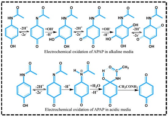 Acetaminophen (N-acetyl-p-aminophenol) (APAP) is a well-known non-narcotic analgesic and antipyretic drug used worldwide as a mild-to-moderate pain reliever and is a common medication to reduce fever. Apart from fever and pain relief, APAP is widely used as an over-the-counter drug for common illnesses, such as cold, osteoarthritis, allergy, and headache. Moreover, APAP monotherapy is recommended to reduce fever in patients with COVID-19 as a targeted antiviral treatment for COVID-19 is currently not available [1,2,3]. In this scenario, the development of an APAP sensor is considered highly significant. Even though APAP is used widely for the aforementioned illnesses, it is to be noted its over dosage leads to hepatotoxicity [4,5]. The APAP toxicity is critical as it causes acute liver failure [6], pancreatitis [7], renal impairment [8], lactic acidosis [9], kidney cancer [10], and skin rashes [11] in human beings. Studies show APAP is a main reason for liver damage in the United States and United Kingdom, and in the United States alone, around 100,000 cases of APAP toxicity are reported every year [12]. A single dose of APAP above 10 g or multiple smaller doses in a day in adults may lead to toxicity. Moreover, investigations show in some people, even normal doses of APAP can lead to toxicity, and it is worth mentioning toxic doses of APAP vary among people [13]. Therefore, the accurate detection of APAP in biological samples is crucial and is a necessity in pharmaceutical formulations for quality control of medicine.
