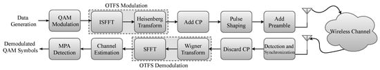 OTFS modulation is composed of cascaded two-dimensional (2D) transforms at both transmitter and receiver, as shown in Figure 1. At the transmitter side, the information symbols X [ l , k ] , k = 0 , , N 1 , l = 0 , , M 1 are mapped in the two-dimensional delay-Doppler domain from the modulation alphabet A to be transmit over N T time duration and using bandwidth B = M Δ f where Δ f = 1 / T , and N and M are the delay and Doppler bins, respectively. Then, inverse symplectic finite Fourier transform (ISFFT) using to map the N × M delay-Doppler grid points into the time-frequency plane as follows