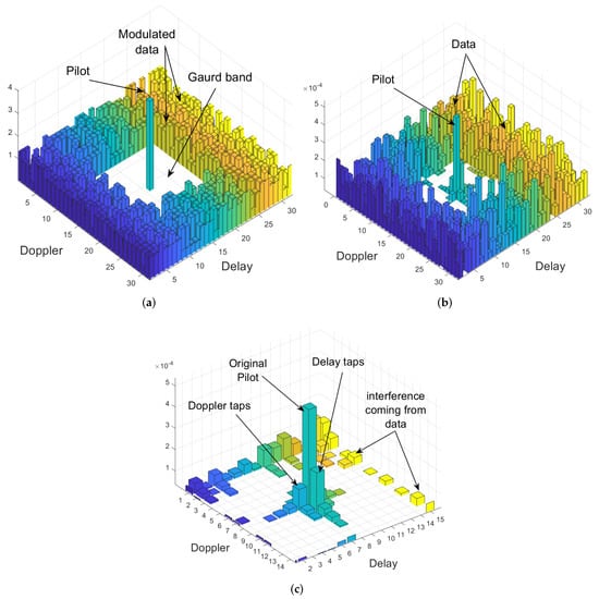 Figure 2. The transmitted and received signal structure in the delay-Doppler plane. (a) Transmitted symbols; (b) received signal; (c) received embedded pilot.