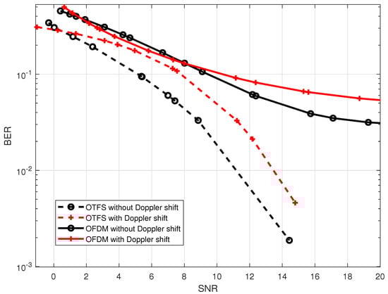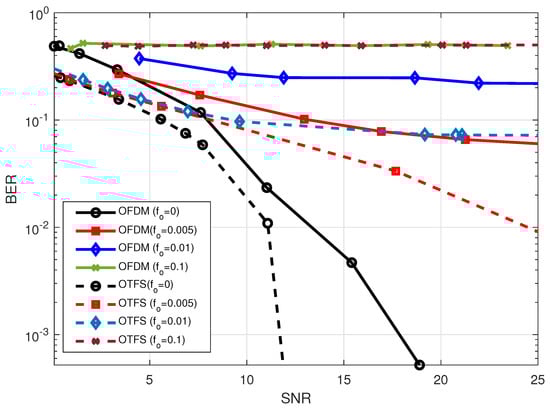 The effect of the Doppler shifts caused by normalized frequency offsets may be seen in the BER performance of the OFDM and OTFS, which is presented in Figure 7. As can be seen in the figure, the BER performance of both the OTFS and OFDM waveforms decays when there is an increase in the value of the mismatching frequency offset. In addition to this, it was demonstrated that OTFS has superior performance in comparison to OFDM, considering the reasons that have been discussed previously.