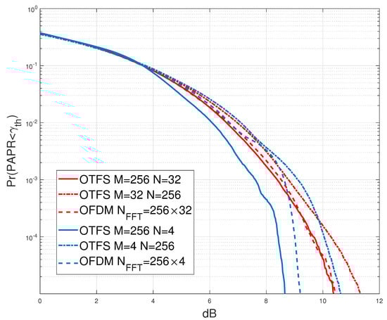 Generally, there are different nonlinearity sources in the RF front-end of communications systems, namely, high power amplifier (HPA) at the transmitter, low-noise amplifier (LNA) at the receiver, mixtures, and analog-to-digital (A/D) and digital-to-analog (D/A) converters [49]. In real-world wireless communication systems, HPAs are the most commonly used component to provide long-distance wireless transmission. According to the nonlinear input-output characteristic of HPAs, the power of the input signal should be amplified within the HPA’s linear range to prevent the HPA from being saturated and causing the out-of-band (OOB) that degrades the system performance [49]. The performance of the HPA amplifier is inversely proportional to the PAPR of the transmitted signal. As a result, the PAPR of the transmitted signal should be as minimal as possible [50]. The PAPR of the OTFS system is expressed as follows [20]
