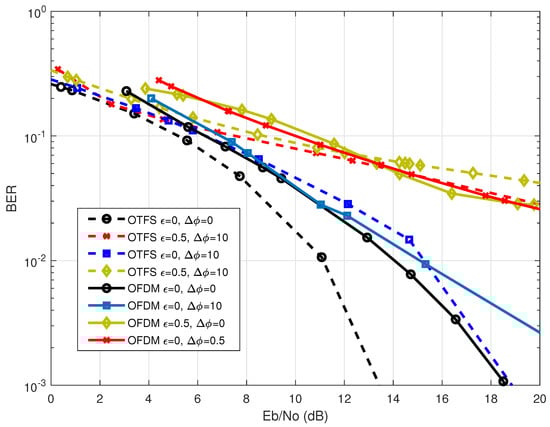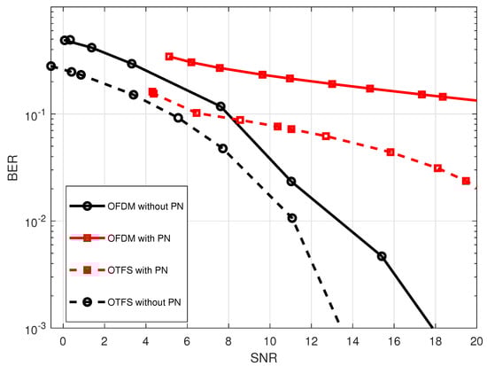 Figure 16. Comparison of the effect of the phase noise on the BER performance for both OTFS waveform with M = 32 , N = 32 and OFDM waveform with N = 1024 at 2.4 GHz carrier frequency.