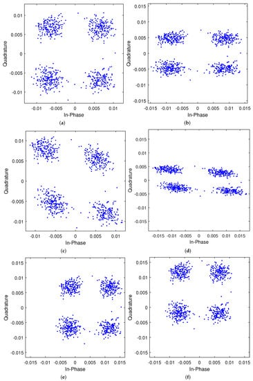 Figure 10. Constellation diagram shows the effect of the different I/Q and DC offset on the M = 32 , N = 32 OTFS received information symbols of y ^ [ k , l ] for 4-QAM at 2.4 GHz carrier frequency. (a) ϵ = 0 , Δ ϕ = 0 ; (b) ϵ = 0 , Δ ϕ = 10 ; (c) ϵ = 0.5, Δ ϕ = 0 ; (d) ϵ = 0.5, Δ ϕ = 10 ; (e) γ I = 0.75, γ Q = 0 ; (f) γ I = 0 , γ Q = 0.75 .