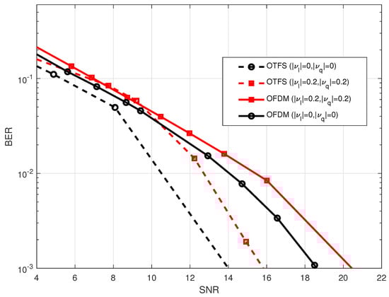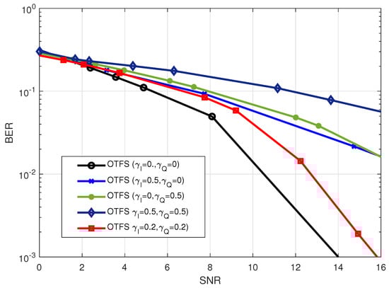 Figure 11. Comparison of the BER performance between OTFS waveform with M = 32 , N = 32 and OFDM waveform with N = 1024 considering different DC-offest in both I-component ( γ I ) and Q-component ( γ Q ) at 2.4 GHz carrier frequency.