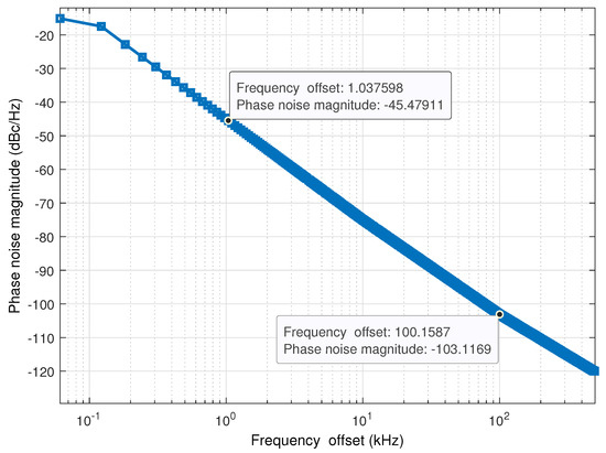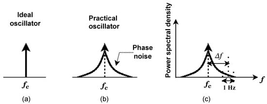 Figure 13. Phase noise of the local oscillator. (a) Ideal oscillator, (b) practical oscillator, and (c) phase noise power level in dBc/Hz with Δ f offset.