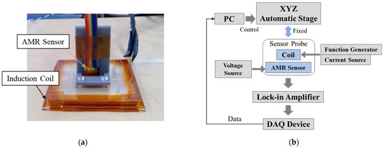 Figure 1b shows the measurement system, which consists of voltage source, current source, function generator, sensor probe, analog-to-digital converter, lock-in amplifier, personal computer (PC), and XYZ stage. The AMR sensor was driven by the 12-V voltage source, and a sine wave current of 200 mAp-p with multiple frequencies (3, 20, 1000 Hz) was applied to the induction coil by the function generator and current source. Steel plates (SM400, 300 × 300 mm2) with thicknesses of 3, 5, 7, 9 mm were used as measurement objects. In the measurement of steel plate thickness, the lift-off was changed by 20 mm in the range from 0 to 80 mm by shifting the stage in the Z direction, and the secondary magnetic field excited by eddy currents was detected.