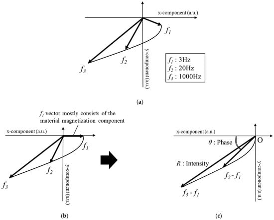 The detected magnetic field can be classified into three components: true magnetic field created by eddy current, residual magnetization in the coil, and material magnetization component. The true magnetic field caused by eddy current can be obtained by subtracting the other components. The residual magnetization component can be measured in the air or at a distance from metallic objects, whereas the material magnetization component can be measured by subtracting the magnetic field of the lowest frequency (Figure 2b). In comparison with other frequency magnetic fields, the magnetic field of the lowest frequency is primarily composed of the material magnetization component, and few true magnetic fields are included. Therefore, by subtracting the 3-Hz vector from the other frequency vectors (hereinafter referred to as 20–3 and 1000–3 Hz), the true magnetic field vectors generated by eddy current can be acquired and the intensity and phase are then calculated from the true magnetic field vectors (Figure 2c).