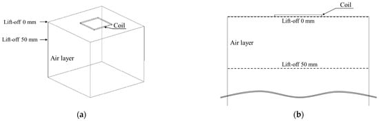 Simulation of magnetic field distributions at lift-offs: (a) 0 mm and (b) 50 mm.