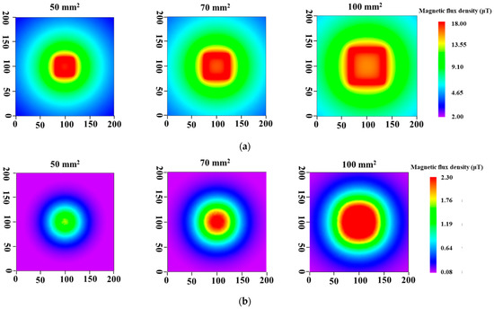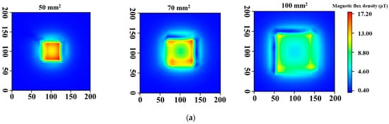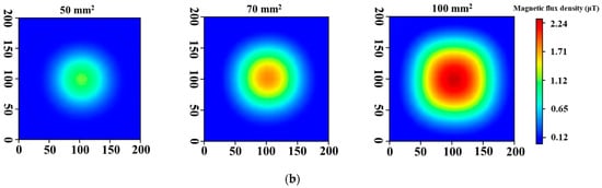 Figure 5 shows the results of simulations. When the lift-off was 0 mm, intense magnetic fields were observed over a wide range as the coil diameter increased, but the magnetic field in the center part became weak, as shown in Figure 5a. By contrast, the magnetic field distributions at the lift-off of 50 mm showed that the intensity became weak and the range of magnetic field for the distributions became narrow compared with those obtained at the lift-off of 0 mm (Figure 5b). However, the intensity increased as the coil size became larger.