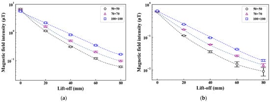 Magnetic field distributions with prototyped probes at lift-offs: (a) 0 mm and (b) 50 mm.