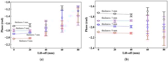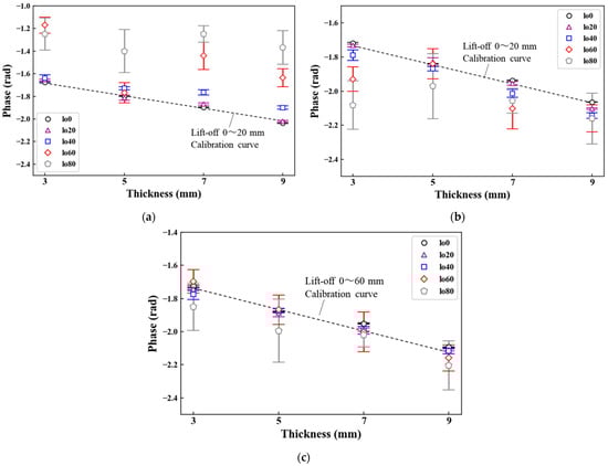 The thickness estimation of steel plates can be conducted using calibration curves of phase and thickness. Hence, when the phase values fluctuate due to the lift-off, the thickness estimation becomes difficult. In this section, the phase values at 20–3 Hz were evaluated with the average and standard deviation calculated from five measurements (Figure 8). With the 50-mm2 probe, the phase values shifted between 0.1 and 0.2 rad as the lift-off increased (Figure 8a). By contrast, the phase values with the 70-mm2 probe were approximately constant in the lift-off range of 0 to 40 mm (Figure 8b). In comparison with the 50 mm2 probe, the phase variation was reduced. However, at the lift-offs of 60 and 80 mm, the phase values fluctuated more than 0.1 rad. Figure 8c shows the phase values with the 100-mm2 probe. Approximately constant phase values were observed in the lift-off range of 0 to 60 mm. Among the three sensor probes, the phase values were the most stable, and their variations were less than 0.05 rad with the 100-mm2 probe. From these results, the 100-mm2 probe is preferable to obtain an accurate calibration curve and thickness measurement with the least fluctuations.