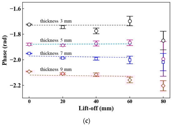 Lift-off dependence of phase (coil area: (a) 50 mm2, (b) 70 mm2, (c) 100 mm2).