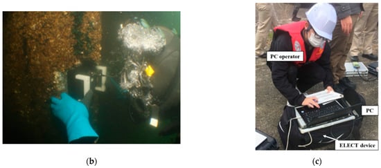 In this demonstration, corroded steel sheet piles installed in the 1970s were measured. The measurement was conducted in concave and convex parts at four depths (Figure 11a). Although the weather was sunny and the sea was calm on the measurement day, the underwater environment was muddy. A diver set up the sensor probe in water and removed the surface deposits (Keren). Simultaneously, workers on the ground operated the PC and communicated with the diver with a wireless device, and the measurement was performed (Figure 11b,c). First, ELECT was applied to the steel sheet pile whose surface deposits were removed. Second, ELECT and UT were applied over Keren.