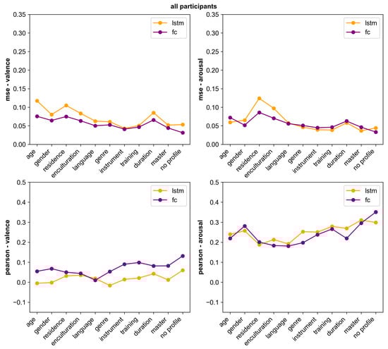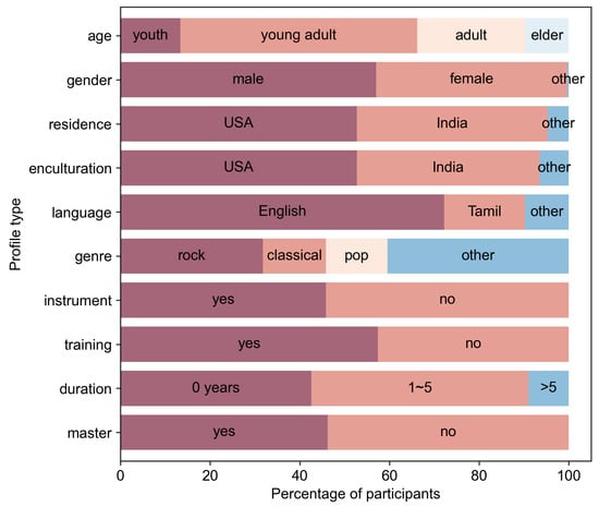 The distributions for participants who have received formal training and those who have not (the eighth profile information-training), closely resemble those of participants who actively play an instrument and those who do not (the seventh profile information-instrument). This is observed despite the fact that there are 43 participants who have received formal musical training but are not actively playing an instrument, and another 11 participants who are actively playing an instrument but have not received formal training. A statistically significant difference is found between these two groups, for both valence () and arousal (). This makes sense, as most participants who play an instrument learned to do so through formal musical training.