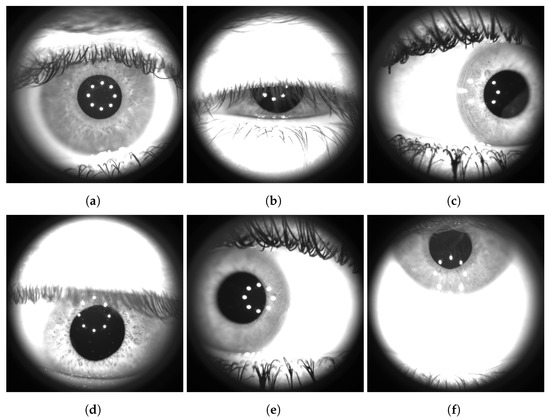 Example of images collected from different subjects of the PopEYE dataset. The images have been labeled in six different categories: (a) correct, (b) closed, (c) right, (d) down, (e) left, and (f) up. As shown in the images, the pupil, the iris, the eyelashes and, in certain cases, the eyelid is visible. Visible white spots disposed in a circle near the pupil are reflections produced by the 8 IR LEDs used to illuminate the eye.