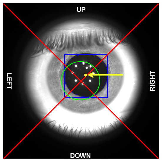Visual aids used for the data annotation phase. The two diagonals in red define the four cardinal regions, named: up, right, down, and left. The green circle determines the central region for “correct” images. The ES algorithm (described in Section 4.1) finds and highlights the pupil bounding box (blue square) and the pupil center (yellow dot, highlighted by yellow arrow) whenever possible to support the human operator in the labeling process.