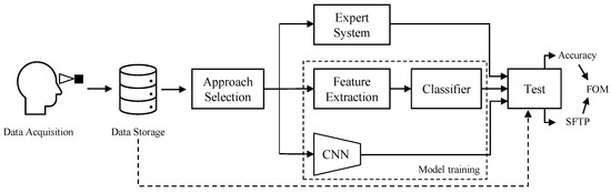 General overview of the proposed analysis. Data are acquired and stored using the device described in Section 3.1 and illustrated in Figure 1. Then, three different approaches based on Expert Systems and Machine and Deep Learning fields are trained and tested on that data, obtaining a final accuracy and SFPT with which it is possible to compute the FOM metric (see Section 5.4).