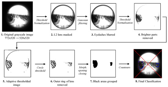 In our case, we aim to code an algorithm based on expert and a priori knowledge to make the final classification, then use an approach commonly referred to as “Expert System”. Specifically, the proposed method is able to automatically detect, through several sequential image processing operations, the eye’s pupil and its position respective to the center of lens L2, i.e., the optical axis of the system (see Figure 1). In the following, we list and analyze the steps of the proposed algorithm, also graphically summarized in Figure 5, to improve understanding and clarity.