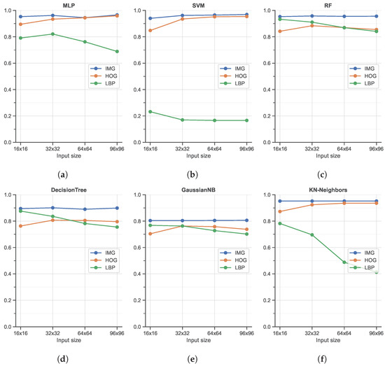 Classification accuracy of the three Machine Learning-based classifiers across different input sizes and input features: (a) shows the performance of the Multi-Layer Perceptron (MLP) classifier, while (b) shows the Support Vector Machine (SVM) classifier, (c) Random Forest (RF), (d) Decision Tree classifier, (e) Gaussian Naive Bayes (GaussianNB) classifier, and (f) K-nearest neighbors (KN-neighbors) classifier.