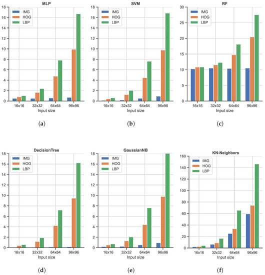 Comparison of the average Single Frame Processing Time (SFPT), computed as time consumed for the feature extraction process plus the prediction time, of the three Machine Learning-based classifiers running on a Desktop computer. (a) Shows Multi-Later Perceptron (MLP) classifier times, (b) Support Vector Machine (SVM) classifier, (c) Random Forest (RF), (d) Decision Tree classifier, (e) Gaussian Naive Bayes (GaussianNB) classifiers, and (f) K-nearest neighbors (KN-neighbors) classifier. The time values are expressed in milliseconds (ms).
