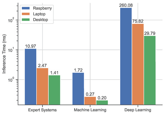 Moreover, as introduced before, one of our goals is to evaluate the computational cost of the proposed algorithms on different systems, thus investigating the eventuality of more portable and more efficient solutions. Therefore, we compared the Single Frame Processing Time (SFPT) among the systems described in Table 4. The SFPT consists of the sum of the elapsed time between the instant in which the frame is available in the RAM memory and the time instant in which the final classification is produced by the system. We observed that, in our scenario, the acquired frames are used in real-time and then the load time, intended as the elapsed time necessary for the system to load the frame from the local hard drive to the RAM, should be neglected. In all approaches described below, the SFPT measurement has been computed as the average on the entire test dataset, i.e., 750 frames per class for a total of 4500 images. In addition, we also report the 90th percentile of the SFPT time in order to highlight the impact of higher prediction times due to variable loads that can affect the performance of the tested systems.
