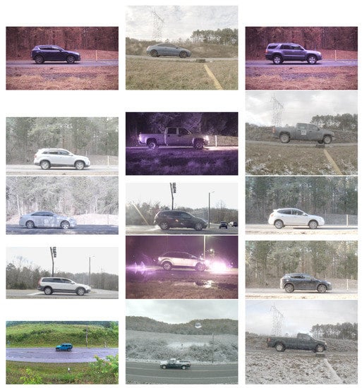 To substantiate the validation of the proposed wheel detector model, we utilized a large dataset of vehicular imagery consisting of thousands of side-view images. The collected dataset was published in [3]. A roadside sensor system was employed to collect vehicle imagery using using various cameras and a radar unit. Side-view vehicle images were taken from distances ranging between 1 and 20 m using 1.8-mm to 6-mm lenses. Vehicle images were collected during both day and night over the course of several years. The road-side cameras were placed both at ground level and at elevated angles, providing a clear profile view of passing vehicles. The collections were done in speed zones ranging 25 to 45 MPH and near intersections where vehicles may have slowed or stopped. Moreover, license plate readers were employed to create a ground-truth label for each vehicle. Actual license plate numbers were replaced with a number and used as a label for the vehicle. In Figure 2, we show some sample images from the PRIMAVERA dataset.