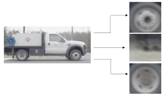 Similar to the vehicle detector, we trained a wheel detector to detect and locate vehicle wheels in video frames. We introduced an older version of the wheel detector in a previous paper [4]. The wheels were manually labeled for 4077 images using LabelImg [29]. The training set was constrained to represent diverse types of vehicles such as sedans, SUVs, trucks, vans, and big-rigs. We also included images that were taken under different lighting conditions. We subsequently retrained the SSD Mobilenet v2 network [27] to provide the bounding boxes information for vehicles’ wheels. Each detection is accompanied with a confidence score. In Figure 4, we show an example of detected wheels. From the figure, it can be concluded that some of the detections might not be accurate. In Section 4, we will elaborate on how we select the best candidate pair of wheels from the wheel detector output.