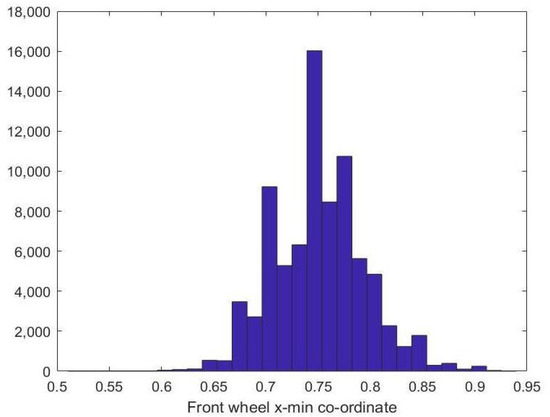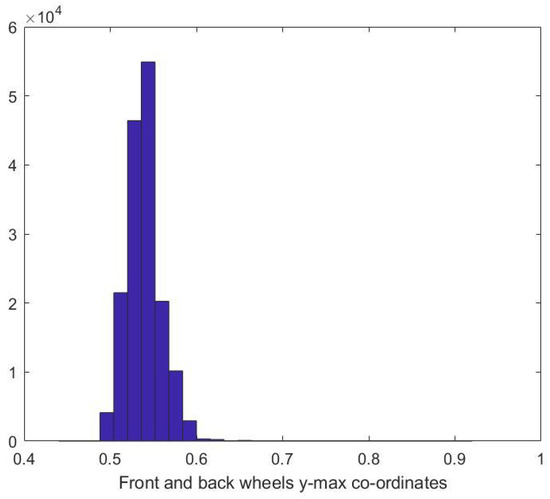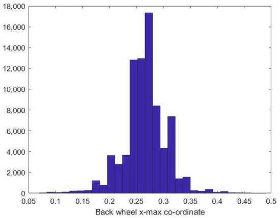 Next, we show the histograms of the wheels location on the x-axis. In Figure 7, the histogram of back wheel coordinate is demonstrated, while Figure 8 shows the histogram of front wheel coordinate. From the plots, it can be concluded that the back wheel typically lies in the back third of the image while the front wheel is located in the front third of the box, assuming the vehicle is moving from left to right.