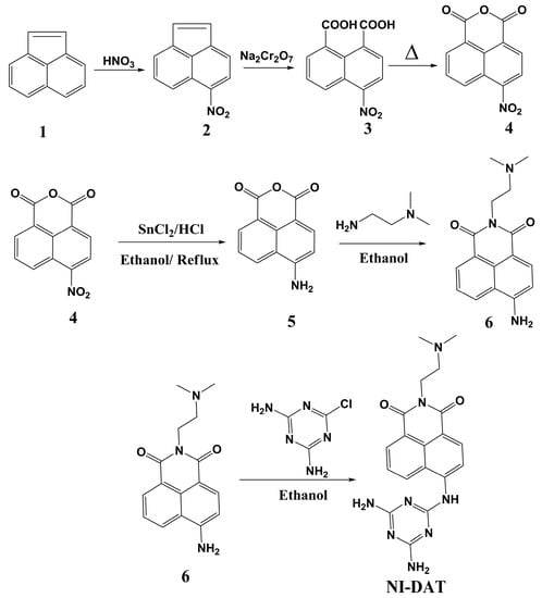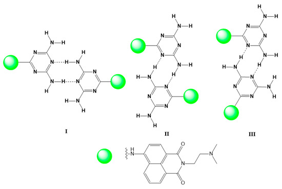 4-(4,6-diamino-1,3,5-triazin-2′-ylamino)-N-(2-dimethylaminoethyl)-1,8-naphthal-imide NI-DAT was prepared according to Scheme 1, presenting the nucleophilic substitution of 2-chloro-4,6-diaminotriazine by a 4-amino-N-(2-dimethylaminoethyl)-1,8-naphthalimide. The chemical structure of NI-DAT was confirmed by IR, NMR absorption, and emission spectra. 1H-NMR spectrum, (see the Supplementary Information), confirms the formation of a stable self-associated dimer of the compound. The design of NI-DAT is based on appending 4,6-diaminotriazine, a well-known chelating moiety, to 4-amino-1,8-naphthalimide, whose photophysical properties are influenced by various stimuli. Moreover, the donor-acceptor-donor feature of DAT that leads to self-associations in solutions (presumably by forming hydrogen-bonded dimers I–III, Figure 1), blocks PET triggering in the system that can be retrieved by stimuli able to separate the probe molecules of their dimers.