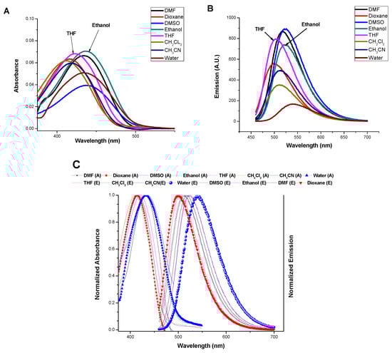 (A) Absorption spectra, (B) emission spectra, and (C) Normalized absorption and emission spectra of NI-DAT in various solvents. λex. = 450 nm.
